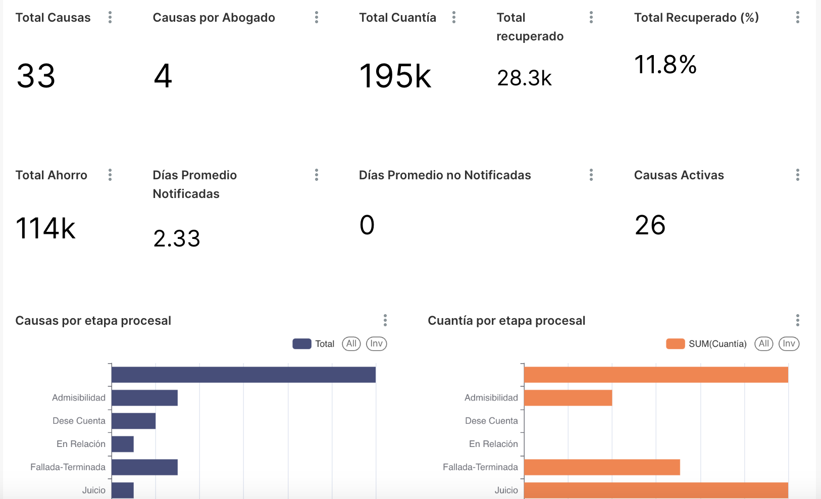 Visualiza el volumen de causas activas, tiempos sin movimiento, juicios en riesgo o etapas críticas. Obtén métricas para evaluar estudios externos, asignar recursos o anticipar recuperos. Todo actualizado automáticamente.